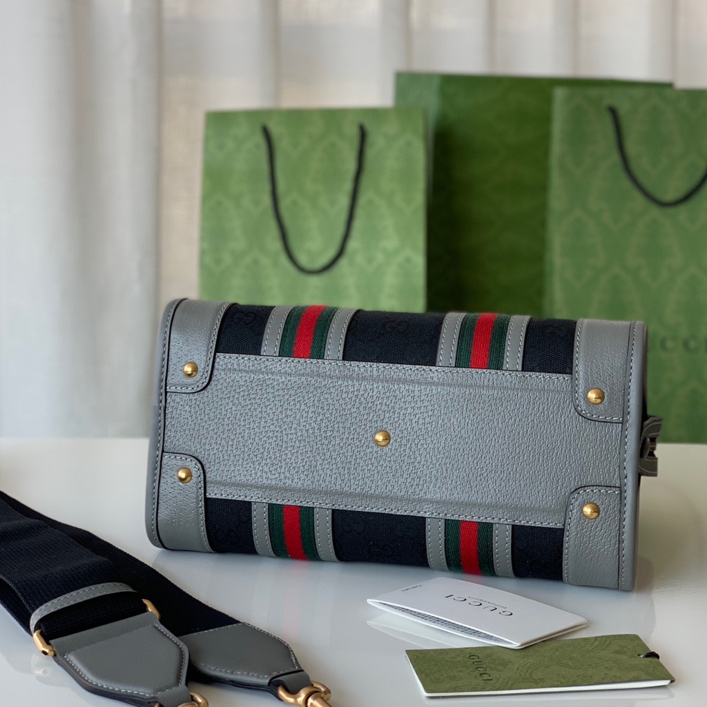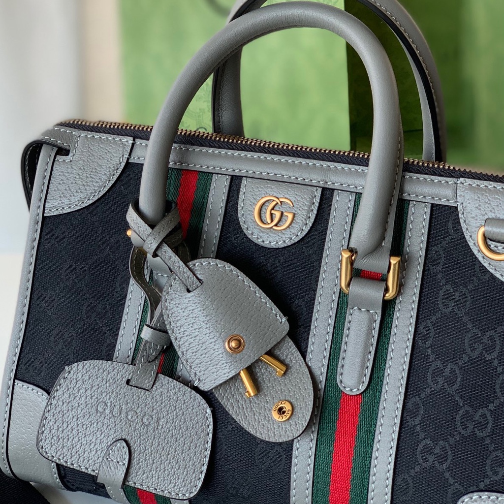 Gucci original Italian leather 💛💛❤️❤️ New exquisite Gucci series small canvas handbag, black classic GG canvas with grey leather, gold accents, detachable leather keychain (side zipper hook metal), cotton and linen lining, model number 715772 canvas grey leather, size 27x18x14~[Rose][Rose]