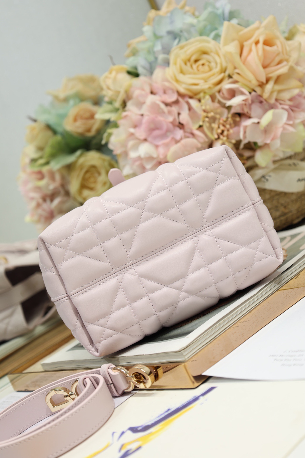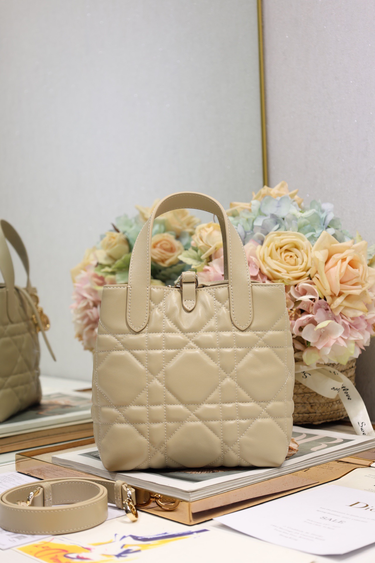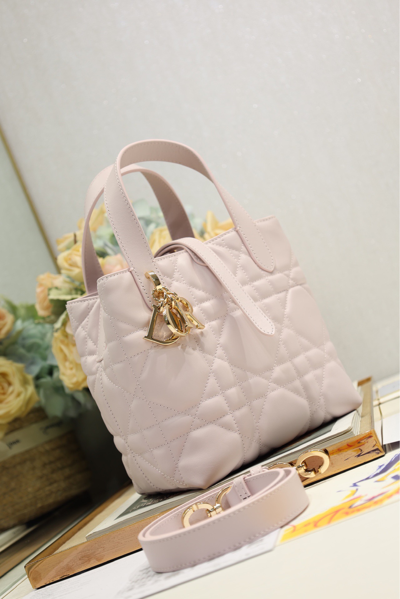 This Toujours vertical handbag is stylish, practical and unique. It is meticulously crafted from light pink cowhide and adorned with a large tartan pattern trim. The spacious interior compartments can hold various daily items. It features a slender leather strap for opening and closing, allowing for safe storage of various items. There is also a Lo-letter D toggle-style clasp that can be adjusted on both sides to enhance the style. The small size model has a leather handle on the top paired with a detachable leather shoulder strap, which can be carried, worn across the body or slung over the shoulder.